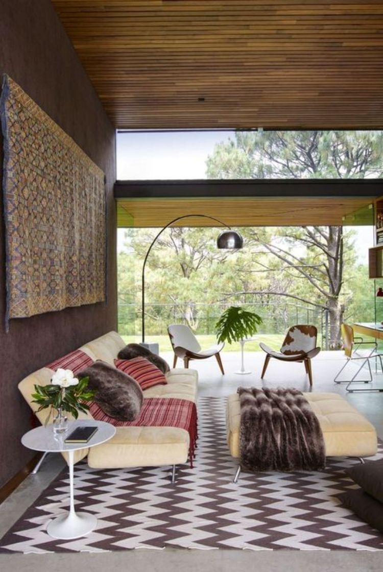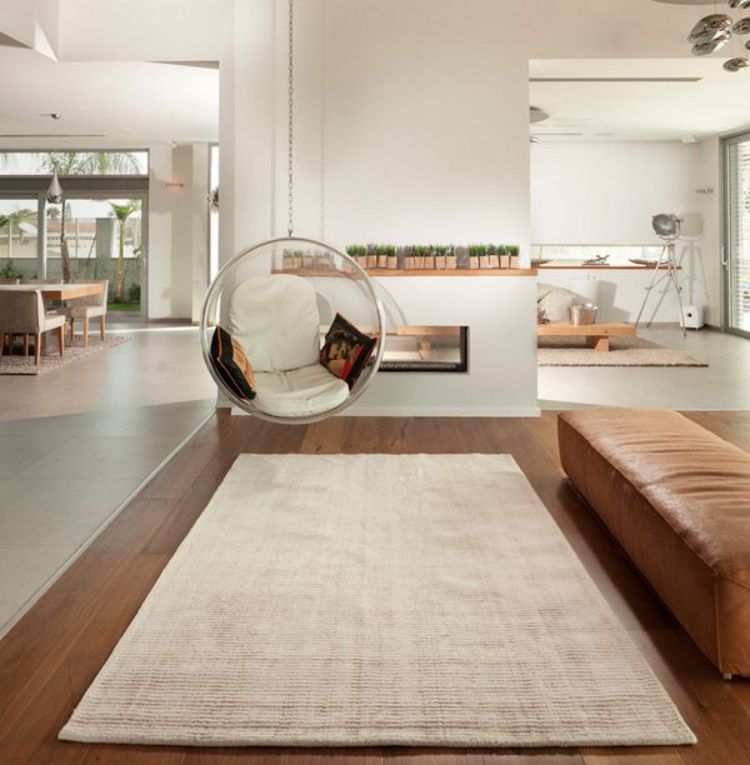 Kursi tamu kulit cokelat ini cocok ditemani dengan kursi gantung bulat. Tambahkan karpet rajut untuk memberikan aksen ruangan yang cantik.