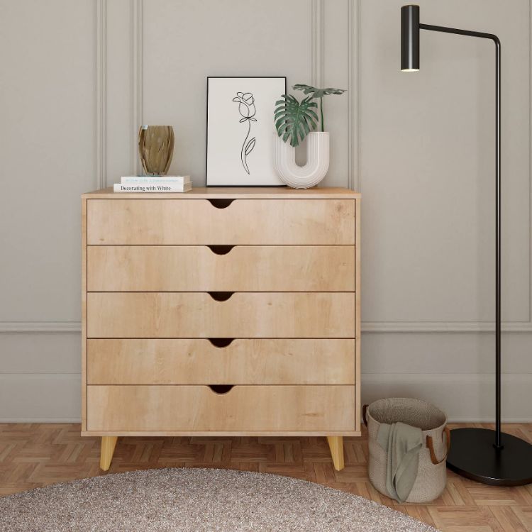 Seperti yang Anda lihat pada gambar laci minimalis di atas, lemari laci ini memiliki 5 pintu yang cukup lebar, sehingga Anda juga bisa menyimpan pakaian di dalamnya. Namun, karena lemari ini terbuat dari material kayu, jadi sangat disarankan untuk meletakkannya di ruangan yang tidak lembap.