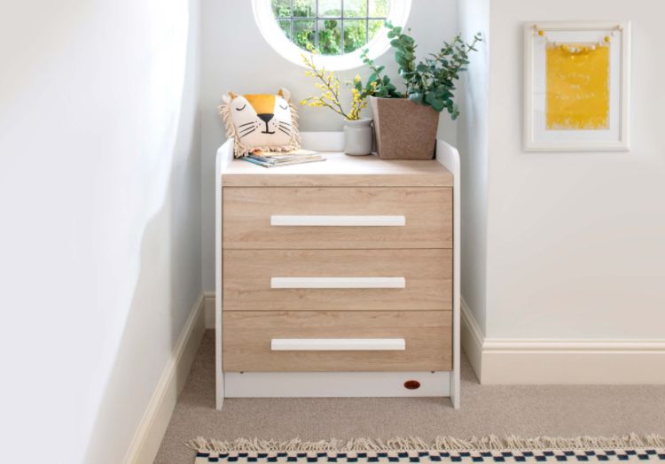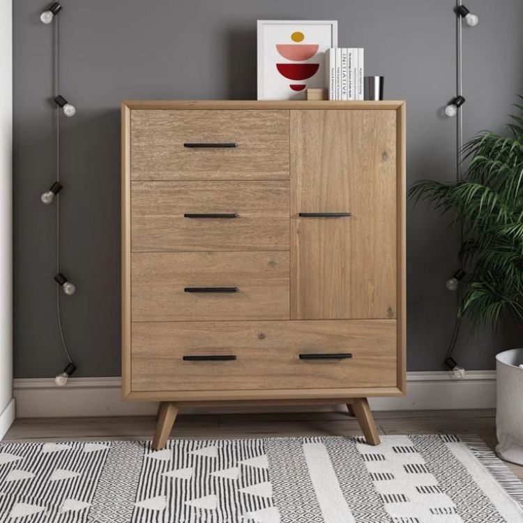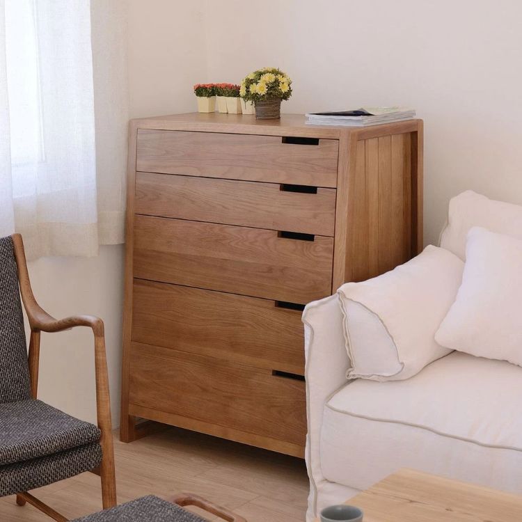 Sama halnya seperti lemari laci tipe melebar yang lainnya, bagian atas laci ini juga dapat dimanfaatkan untuk menyimpan barang-barang kecil yang ada di kamar. Selain itu, daya tarik utama dari lemari laci yang terbuat dari bahan kayu asli ini adalah kesan hangat dan lembut yang bisa dipancarkannya.