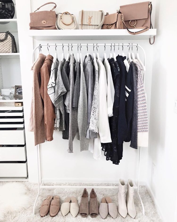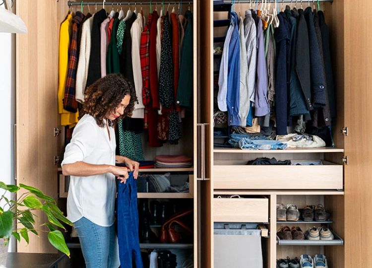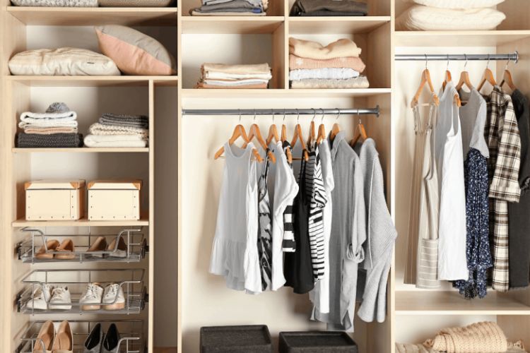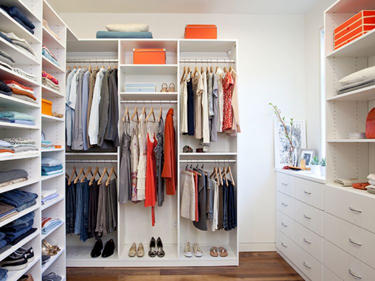 Desain lemari terbuka banyak digemari karena memberikan kesan yang estetik dan praktis. terdapat 3 jenis penyimpanan pada ruangan ini, yakni gantungan baju, rak menyimpan baju dilipat, dan rak untuk penyimpanan sepatu.