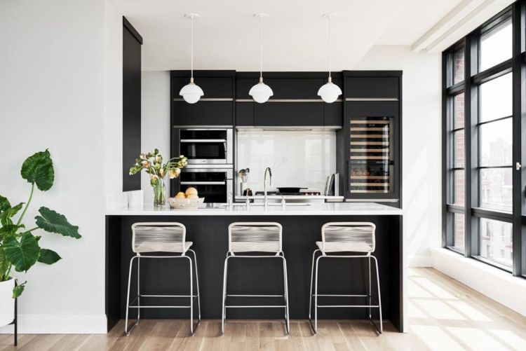 Bisa Anda lihat pada gambar tersebut, meja dan kursi bar didesain menggunakan warna hitam dan putih yang sangat elegan. Begitu juga dengan interior kitchen set yang dihias dengan warna serupa. Perpaduan warna demikian mampu menghidupkan suasana dapur seperti di dalam sebuah bar.
