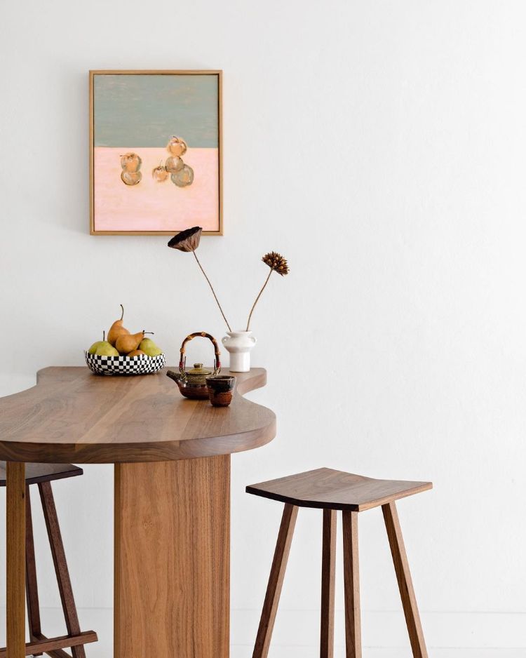 Seperti yang bisa Anda lihat apada gambar tersebut, sebagian besar warna dari set meja dan dapur adalah warna kayu cerah. Hal ini memancarkan kesan aesthetic yang serasi satu sama lain. Kursi minimalis yang melengkapi meja tersebut juga tampak unik dengan warna hitam dan putih.