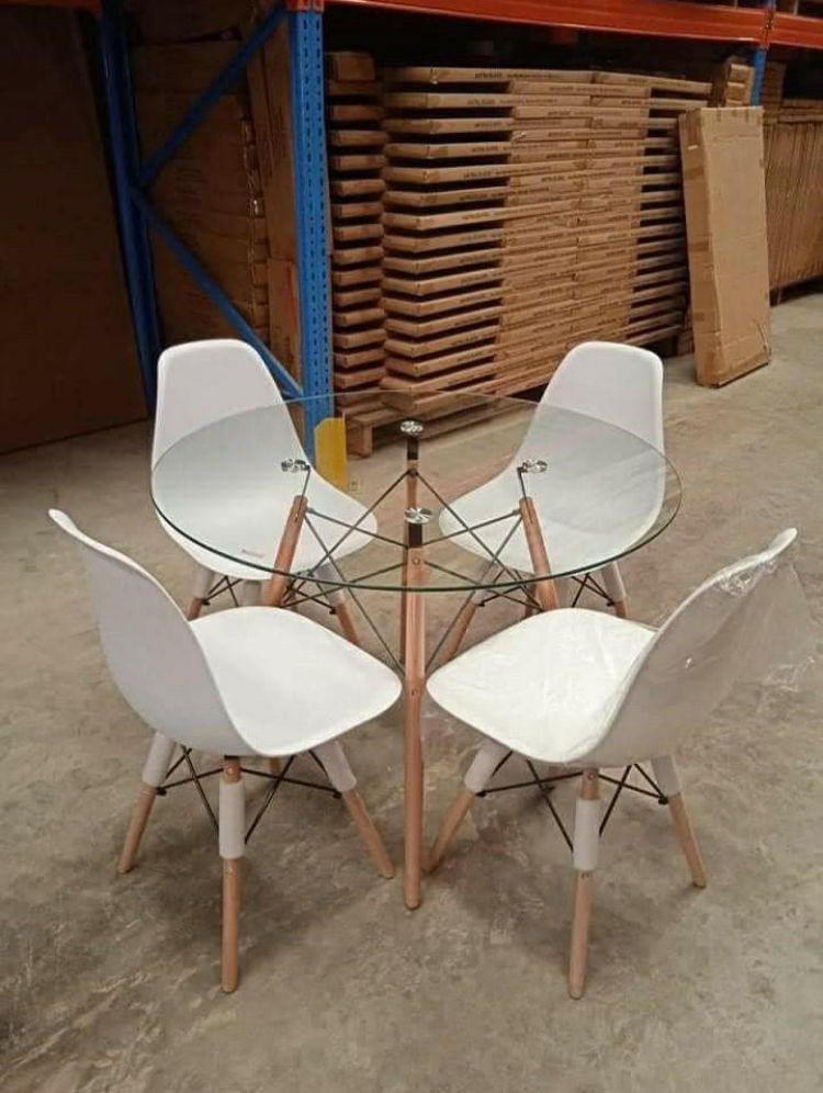 Meja berbahan kaca bening satu ini sangat cocok digunakan menjadi meja bulat minimalis ruang tamu. Anda cukup menambahkan empat buah kursi berwarna putih tanpa armchair di sekeliling meja.