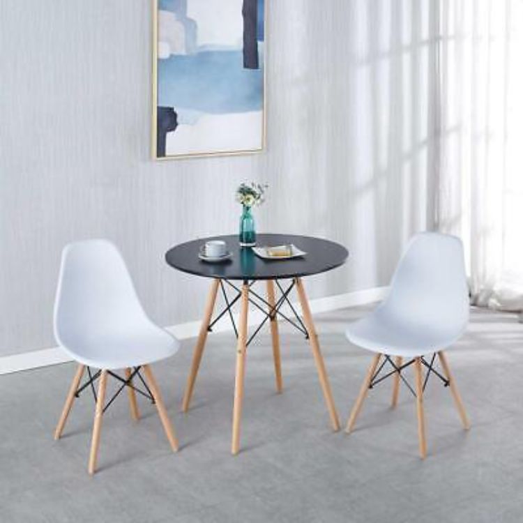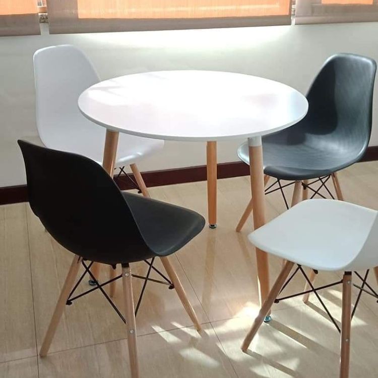 Kursi berbahan plastik dikombinasikan dengan kaki penopang dari kayu membuatnya serasi dengan meja bundar kayu di tengahnya.