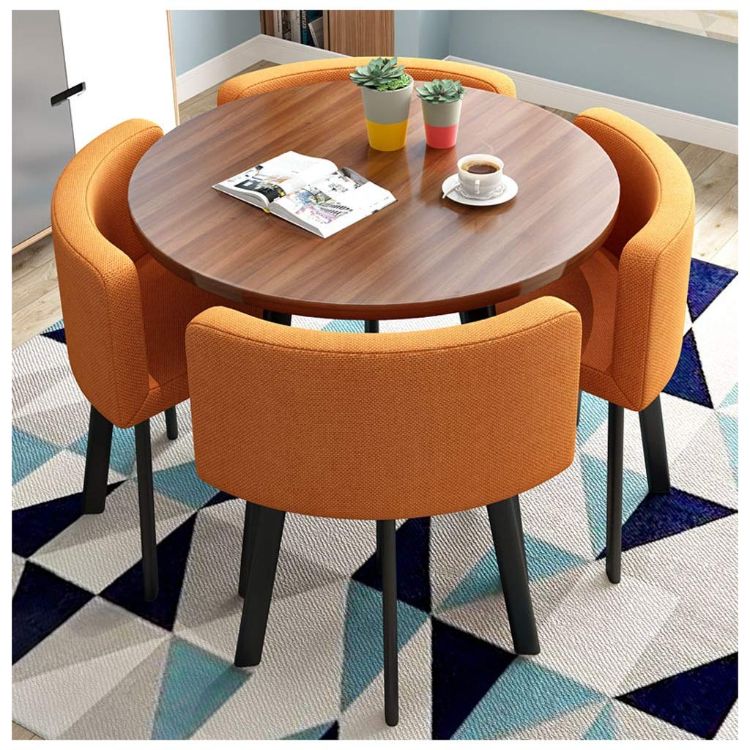 Meja bundar minimalis satu ini dikombinasikan dengan sentuhan modern berkat penggunaan kursi uniknya di sekelilingnya. Kursi dibuat bentuk melengkung yang memang sedang populer sekarang digunakan di perkantoran dan sebagainya.