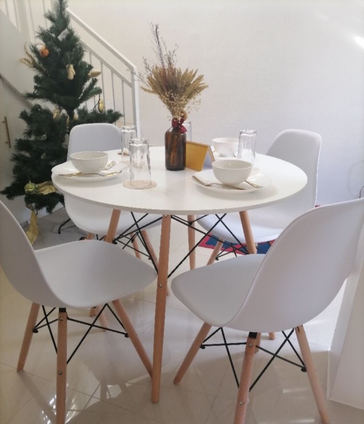 Meja dan kursi serba putih ini cocok digunakan sebagai tempat makan dan bersantai di ruang keluarga.
