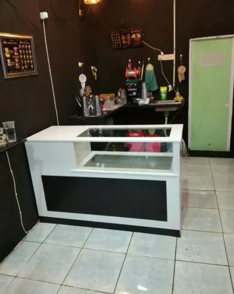 Seperti yang terlihat pada gambar di atas, meja kasir berukuran minimalis sangat pas untuk toko yang membuka usaha makanan atau minuman. Lapisan laci kaca yang ada di meja bisa digunakan sebagai tempat untuk meletakkan komputer yang menyimpan data penjualan.