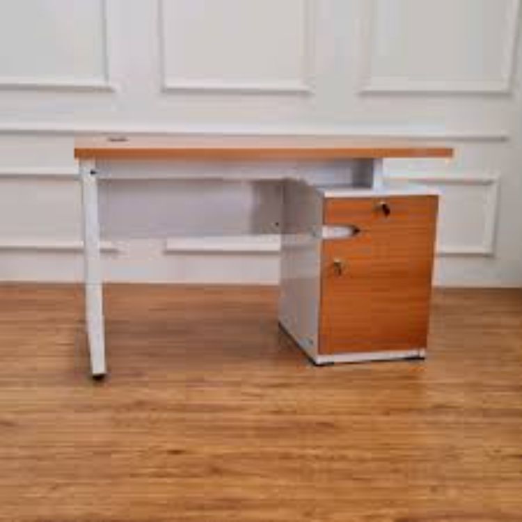 Warna merah dan putih dari meja tersebut selaras dengan rak dokumen yang ada di belakangnya. Meskipun mempunyai desain yang minimalis, namun meja tersebut sudah dilengkapi rak penyimpanan dokumen. Meja seperti ini juga banyak ditemukan di ruangan kasir perkantoran.