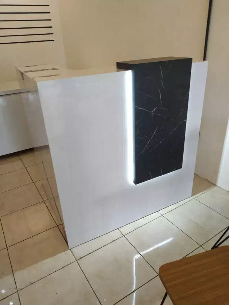 Pada meja sebelumnya juga sudah dibahas tentang meja kasir dengan lampu LED. Kali ini juga berkaitan dengan meja yang dilengkapi lampu LED namun desain meja yang lebih kompleks. Meja berbentuk letter L ini sangat pas digunakan sebagai meja kasir receptionist.