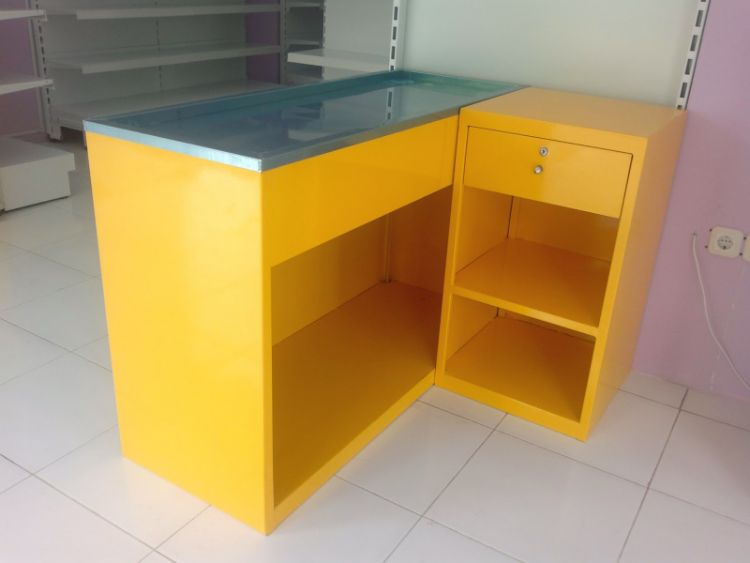 Tampilan meja dengan model seperti pada gambar di atas menunjukkan kesan simple dan padat. Hal ini ditunjukkan oleh adanya laci yang mampu memuat dokumen dan keperluan kasir sehingga dapat digunakan dengan baik.