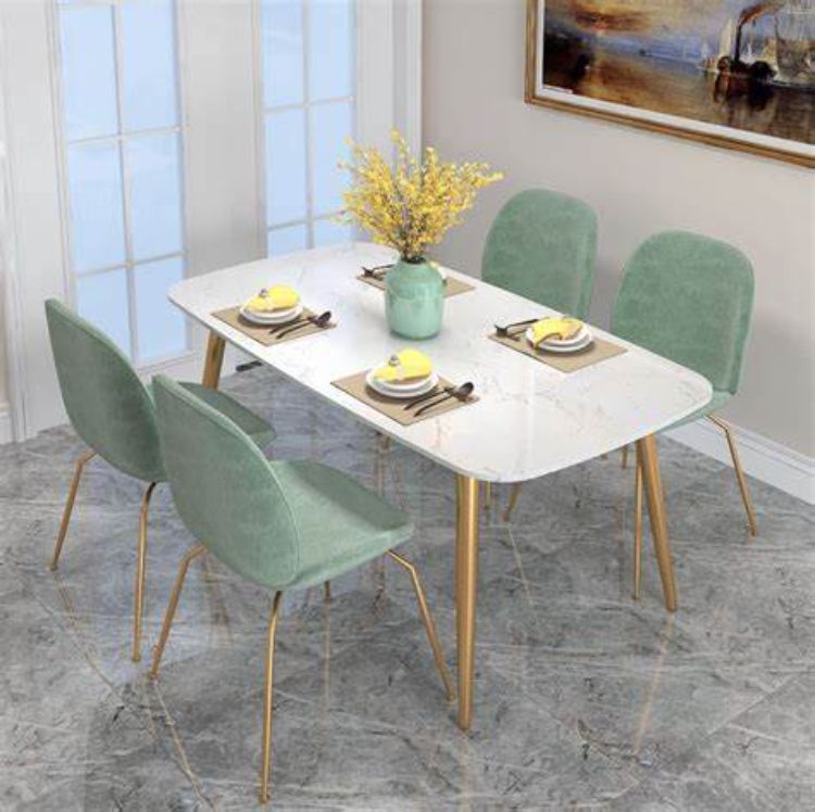 Rumah Anda dipenuhi warna-warna pastel? Tidak masalah, karena model meja makan ini menggunakan kursi berwarna mint dengan aksen emas yang glossy.