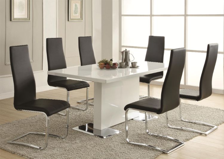 Biarkan nada warna hitam putih membuat ruang makan terasa formal. Terlebih penggunaan kursi makan dengan bagian belakang yang cukup tinggi. Meja ini mempunyai satu balok kaki yang tebal dan kuat.