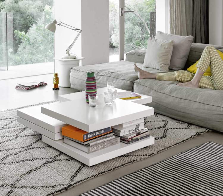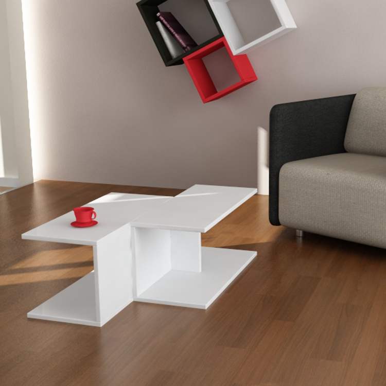 Desain meja tamu satu ini sangat unik karena dibentuk seperti susunan dua huruf L yang saling terbalik. Ukuran meja terbilang kecil sehingga tidak akan memenuhi ruangan.
