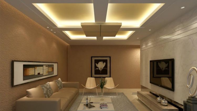 Bagi yang sedang mencari desain plafon gypsum ruang tamu minimalis, maka model square wajib masuk dalam daftar Anda. Mengusung model kotak-kotak dengan list berwarna putih yang serasi dengan pencahayaan berwarna kuning. Pastinya akan membuat ruang tamu mungil jadi lebih nyaman.
