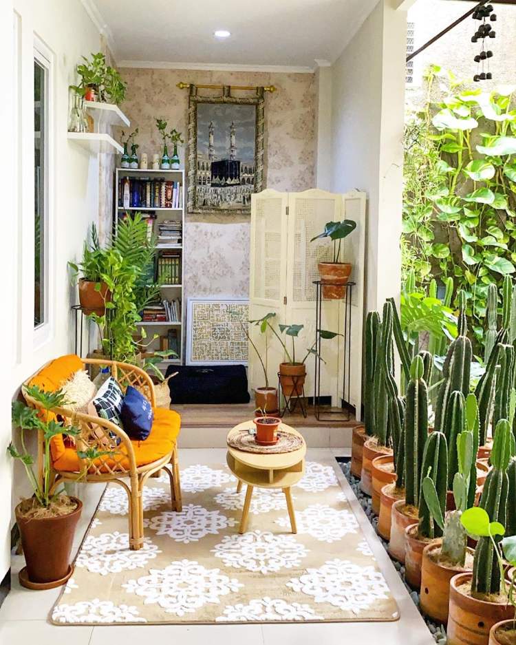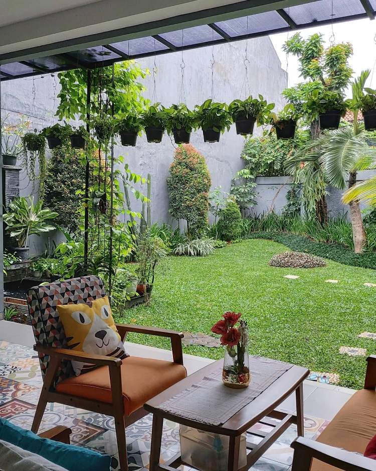 Untuk menyiasati lahan yang minim, Anda bisa membuat taman yang menyatu dengan teras. Menata beberapa tanaman hias di sekeliling taman dan rumput hijau di bagian tengah akan membuat teras rumah Anda semakin indah. Tentunya tamu yang datang akan semakin betah.