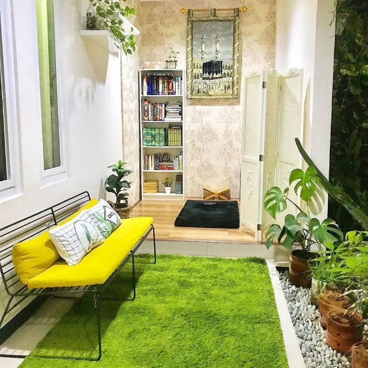 Ruangan shalat yang mungil pastinya hanya cukup untuk satu sampai dua orang saja. Oleh karena itu, bagi yang ingin shalat selanjutnya bisa menunggu dengan duduku di kursi yang tersedia. Selain itu, desain mushola pada gambar mempunyai konsep nature yang pekat dengan adanya rumput dan bunga hijau.