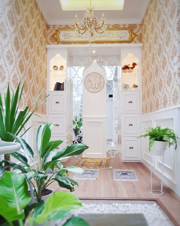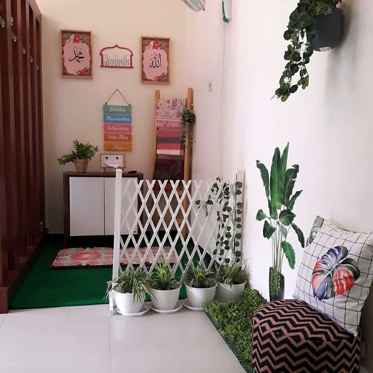 Mushola minimalis seringkali digunakan sebagai tempat shalat bagi anggota keluarga hingga para tamu yang datang. Anda cukup membuat mushola mungil di sudut ruangan rumah Anda dan bisa menambahkan beberapa hiasan seperti bunga gantung atau tulisan Allah SWT dan nama Nabi Muhammad SAW.