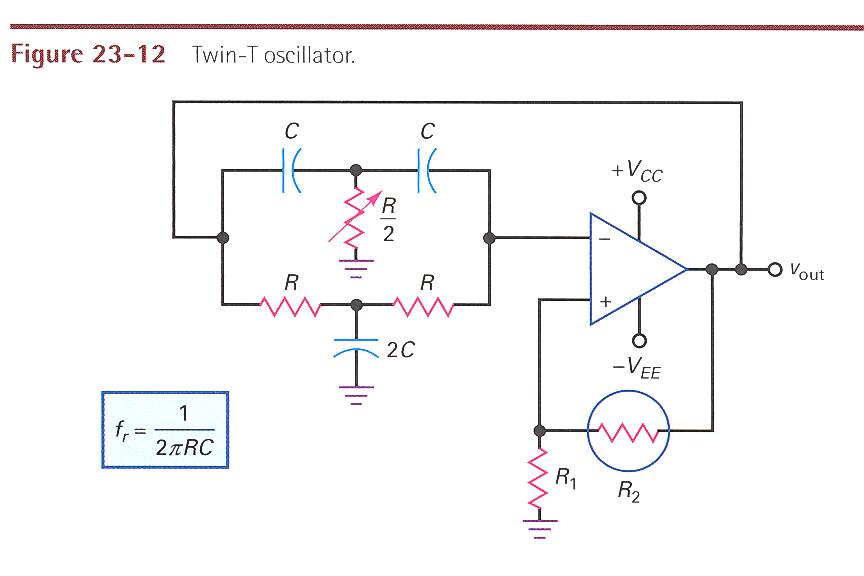 - Osilator Jembatan Wien yang masuk dalam jenis osilator RC. Nama lainnya yaitu “Twin-T” karena memakai dua “T” sirkuit TC yang beroperasi secara paralel. Satu rangkaian merupakan RCR “T” yang berperan sebagai filter low-pass. Satu rangkaian lagi merupakan CRC “T” yang berperan sebagai penyaring bernilai tinggi. Keduanya membentuk jembatan yang dibuat pada frekuensi yang diinginkan.