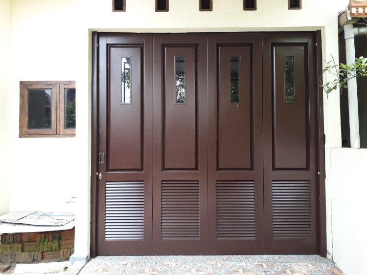 Desain ini sangat populer dalam membuat pintu garasi minimalis. Warna coklat juga menjadi warna yang banyak diincar oleh pengguna karena dapat diaplikasikan dengan berbagai warna apapun. Pada bagian atasnya terdapat kaca yang dapat memasukkan sinar matahari ke dalam ruangan.