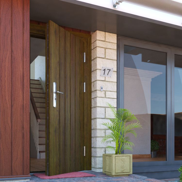 Pintu di atas terbuat dari kayu dan dikombinasikan dengan alumunium bewarna hitam sehingga menambah kesan elegan dari pintu tersebut. Berbeda dari pintu kayu pada umumnya, pintu ini mampu menyelaraskan desainnya dengan desain jendela di sekitarnya.