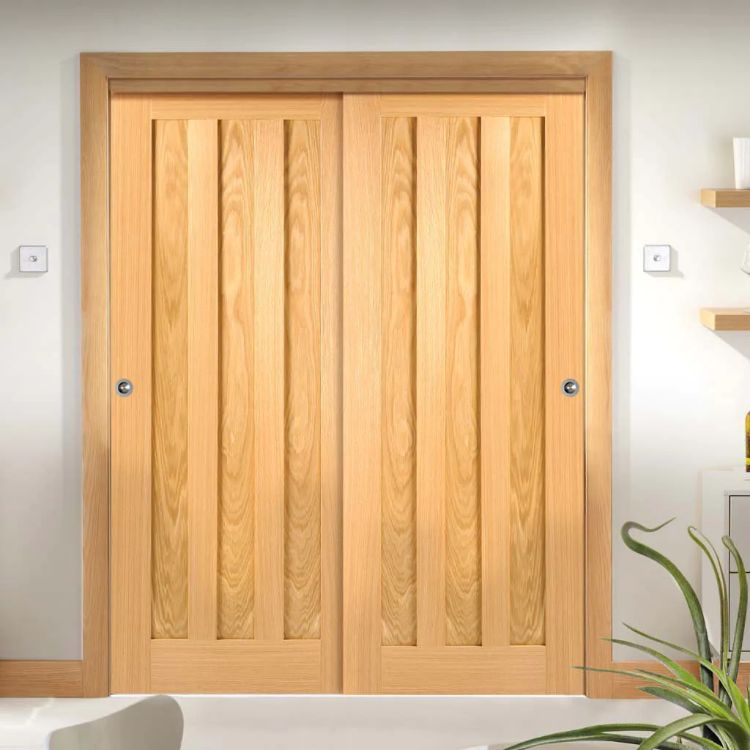 Hadirkan kesan menawan pada ruang tamu dengan mengaplikasikan pintu penyekat berwarna coklat muda motif vertikal. Meskipun desainnya terlihat sangat sederhana, namun tidak bisa menutupi kesan klasik alami pada pintu ini. Bahkan, motif dan modelnya tampak mewah seperti terbuat dari mahoni.