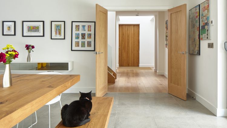Ruang keluarga minimalis akan tampak semakin manis dipadukan pintu triplek berwarna coklat muda polos tanpa motif. Warnanya yang cukup terang terlihat match dengan lantai kayu berwarna natural. Pintu triplek minimalis ini sangat cocok apabila digunakan sebagai penyekat ruang keluarga dan dapur.