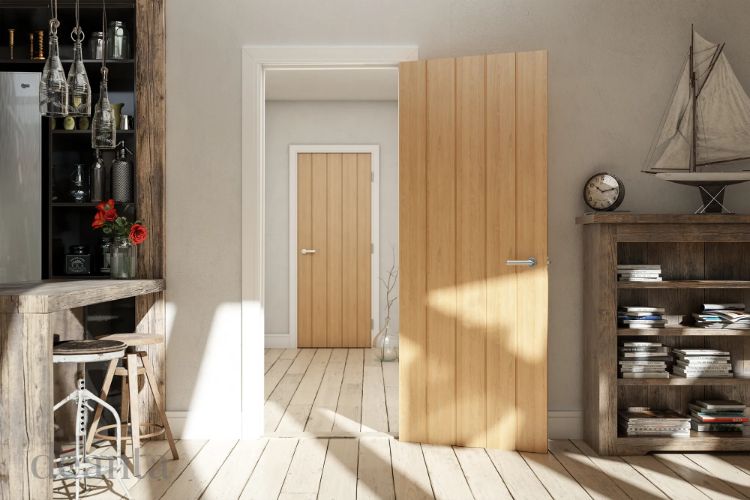 Jika Anda sedang mencari referensi pintu triplek untuk digunakan di kamar tidur, maka model single swing bermotif horizontal bisa menjadi pilihan terbaik. Selain tampilannya lebih simple, motif yang dimiliki juga tampak lebih natural, sehingga lebih match dengan furniture kayu yang ada pada ruangan Anda.