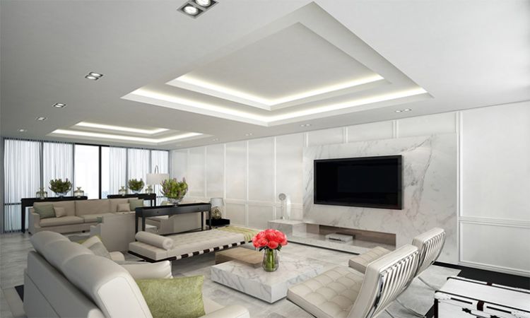 Jika Anda berencana untuk melakukan renovasi ruang hiburan, pilih desain ini untuk mendekorasi plafon. Kesederhanaan adalah hal yang paling dijunjung dalam interior bergaya minimalis. Buat desain persegi dua lapis untuk meningkatkan tampilan langit-langit ruangan.