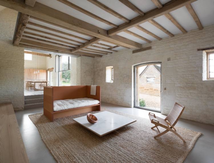 Selanjutnya, plafon rumah minimalis dengan atap bata, ditambah rangka kayu berwarna coklat natural. Ini cocok dikombinasikan dengan lantai berwarna abu muda, ditambah furnitur yang serba berwarna kayu.