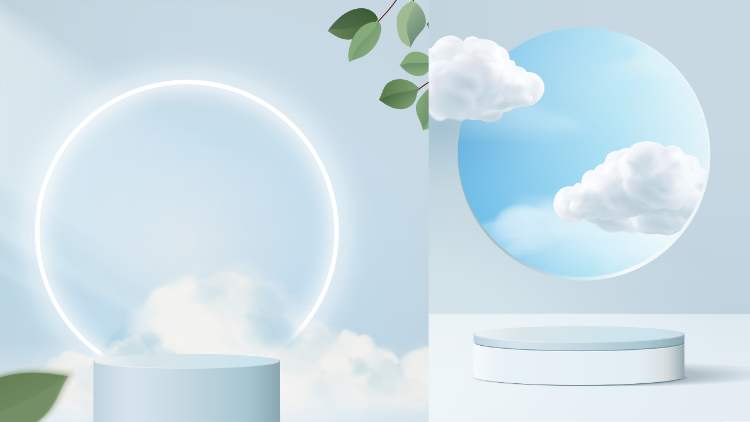 Ciptakan kesan seperi melayang di langit dengan desain mimbar podium unik satu ini. Podium berwarna biru pastel didesain dengan bentuk sederhana berupa mimbar bulat rendah. Dinding belakang mimbar dihias seperti langit biru cerah dengan awan putih di sekitarnya.