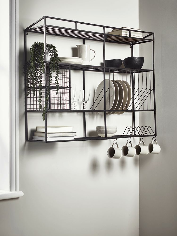 Rak gantung satu ini mengkombinasikan penggunaan material kayu dan juga besi ke dalam satu tempat. Sentuhan interior industrial satu ini dijamin akan membuat tampilan dapur Anda semakin elegan. Anda bisa menyimpan koleksi mug keramik pada cantelan besi yang dibentuk melengkung di bawah panel kayu.