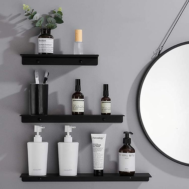 Bingung bagaimana cara mendesain kamar mandi minimalis yang manis dan rapi? Anda bisa menginstal rak floating atau rak melayang di dinding seperti pada gambar. Rak dinding ini tidak menggunakan braket besi penyangga di bagian bawahnya sehingga tampak seolah-olah menempel di dinding.