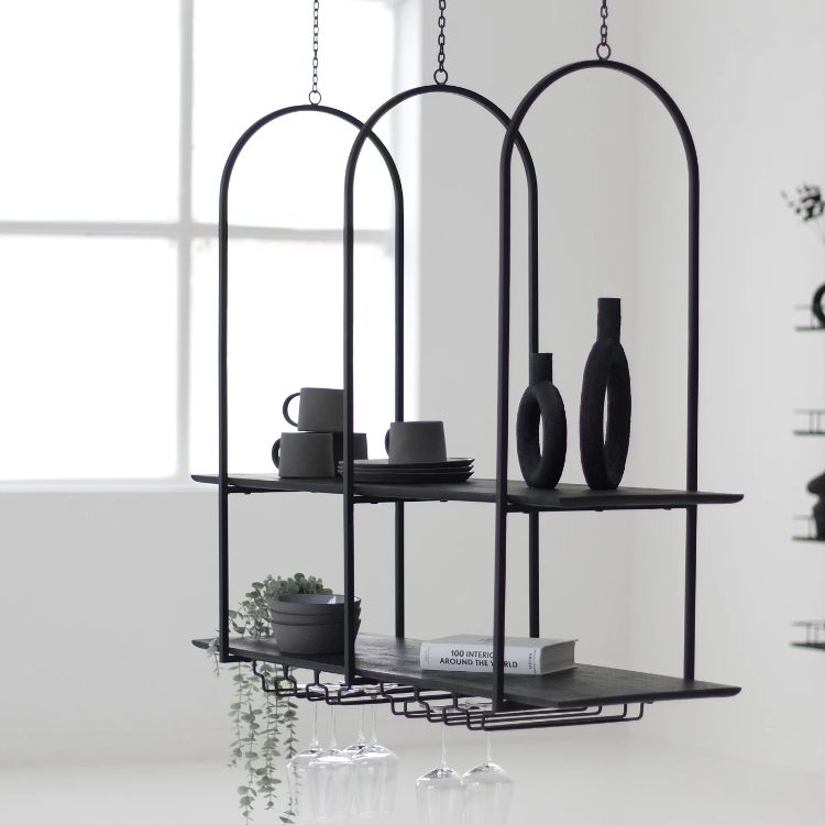 Rak gantung satu ini sangat unik dan berbeda dari rak gantung kebanyakan. Jika rak floating umumnya diinstal dengan cara menempel ke dinding, maka rak satu ini dipasang dengan cara menggantung dari langit-langit.