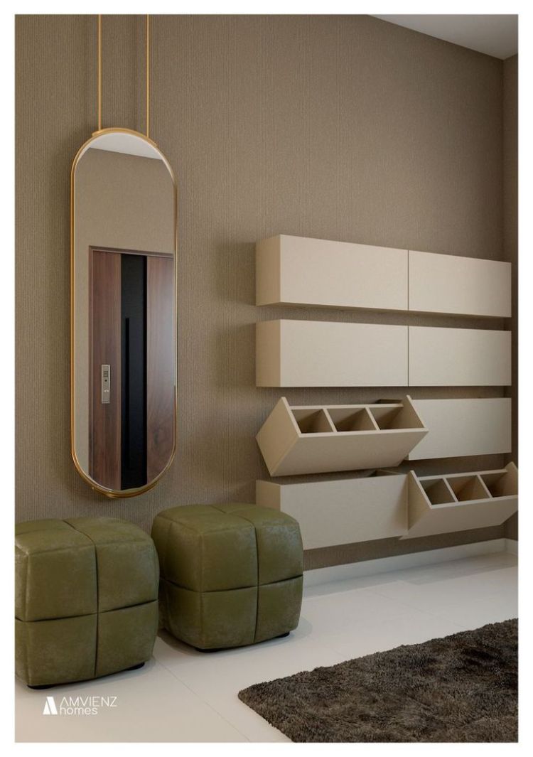 Manfaatkan area kosong di ruang tamu Anda untuk dijadikan tempat penyimpanan sepatu. Rak sepatu minimalis unik ini mempunyai kompartemen terbuka dan luas.