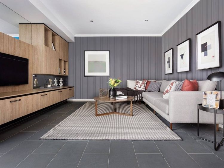 Menggunakan desain dinding dengan warna abu-abu bergaris vertikal membuat ruangan menjadi terkesan lebih tinggi dan juga lebih luas. Anda bisa menambahkan set furniture seperti sofa dan juga hiasan pada dinding.