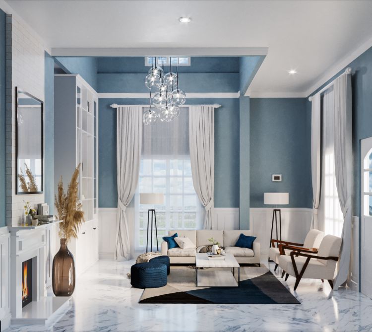 Ruang keluarga yang berwarna biru akan membuat kesan tenang, kalem, sejuk, dan juga segar untuk orang yang beraktivitas di dalamnya. Anda bisa menggunakan berbagai furniture dengan warna putih sehingga menjadi sebuah kombinasi yang sangat menarik.