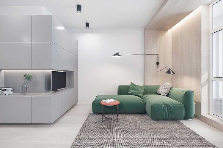 Desain yang satu ini memiliki gaya futuristik dengan desain yang mewah, Anda bisa menggunakan sofa berwarna mint yang menimbulkan kesan sejuk dan segar. Furniture untuk televisi juga dibuat sangat minimalis dengan desain tanpa banyak ornamen.