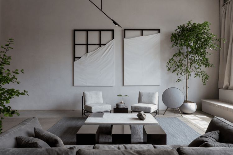 Tambahkan aksesoris abstrak berupa bingkai kayu yang dilapisi oleh kain putih tidak simetris. Agar ruangan lebih berwarna, letakkan juga tumbuhan di dalam pot putih bulat.