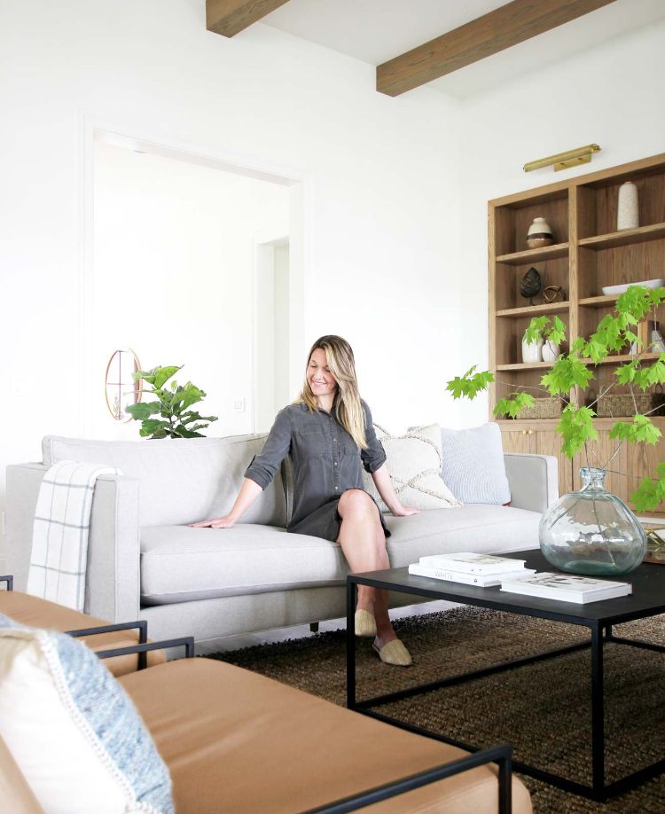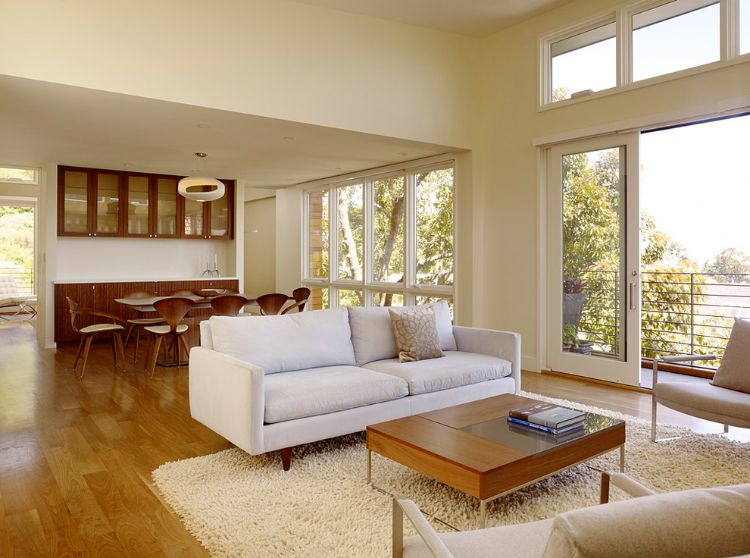 Gunakan lampu dengan tiang lengkung untuk mempercantik ruang. Posisikan sofa menghadap ke jendela kaca besar agar lebih lapang.