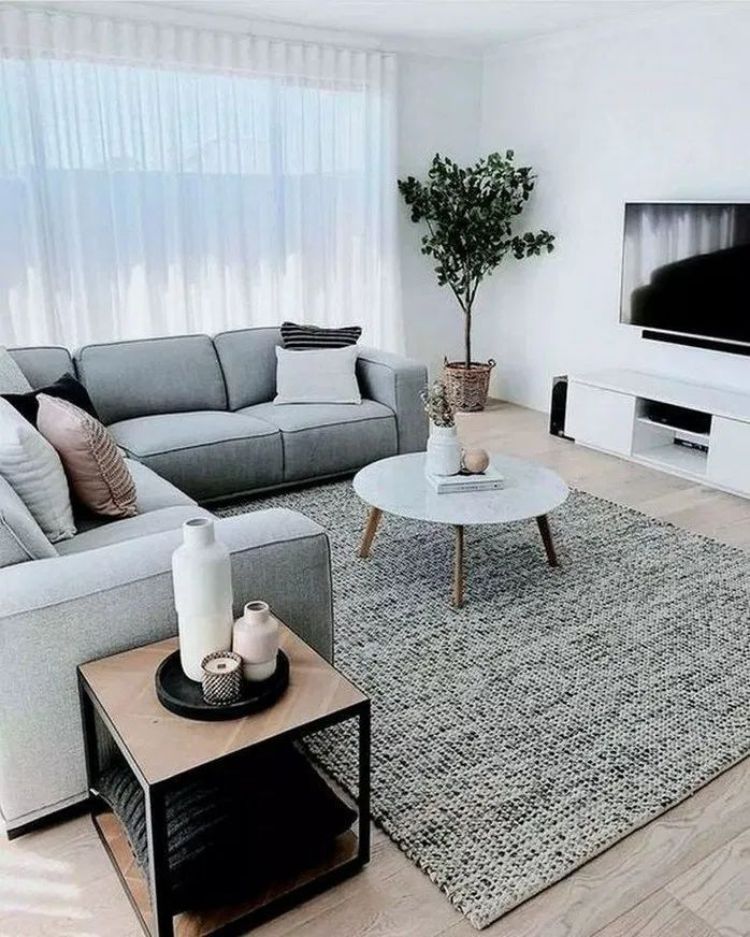 Ruang tamu bertema minimalis modern bisa Anda ciptakan dengan menggunakan furniture berupa sofa berwarna abu-abu muda. Tambahkan alas berupa karpet berwarna senada.