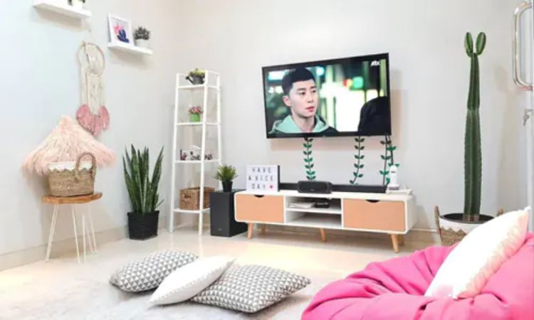 Desain ruang TV yang seperti ini menjadi incaran bagi para pemuda saat ini. Tampilan yang cukup sederhana dengan beberapa dekorasi menarik membuat desain ini tampak instagramable. Biasanya desain ruangan ini akan menggunakan berbagai dekorasi berupa tulisan atau gambar.