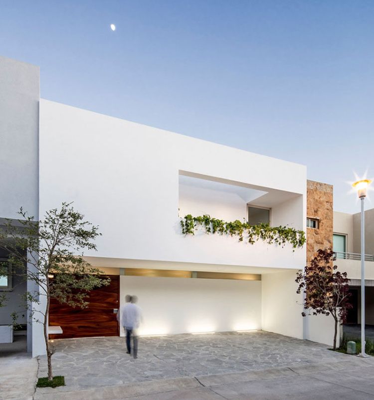 Konsep rumah minimalis bisa dikombinasikan dengan gaya futuristik untuk menciptakan nuansa modern yang lapang di depan rumah. Rumah ini didominasi oleh cat tembok berwarna putih dengan lantai atas yang menjorok ke bagian depan.