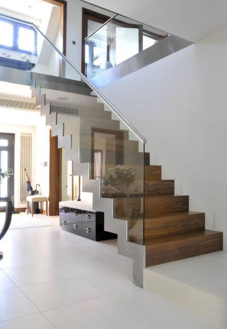Material kaca juga bisa dibuat sebagai pagar dari tangga rumah minimalis. Kaca transparan membuat tampilan tangga tampak lebih mewah. Model tangga satu ini bisa ditemukan di vila atau rumah mewah.