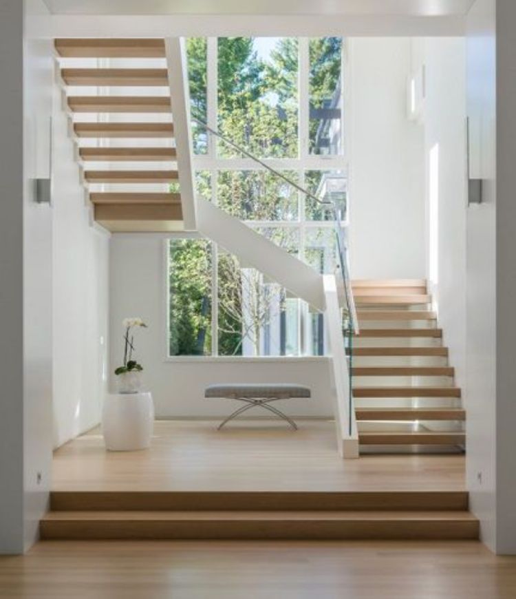 Jika tangga ingin dibangun di space ruangan yang sempit, maka model tangga kayu bertingkat bisa dijadikan sebagai solusi. Tangga minimalis kayu ini dibuat dengan tiga belokan atau tiga tingkatan sehingga kemiringan tangga tidak terlalu curam dan bisa dibangun di sudut ruangan.