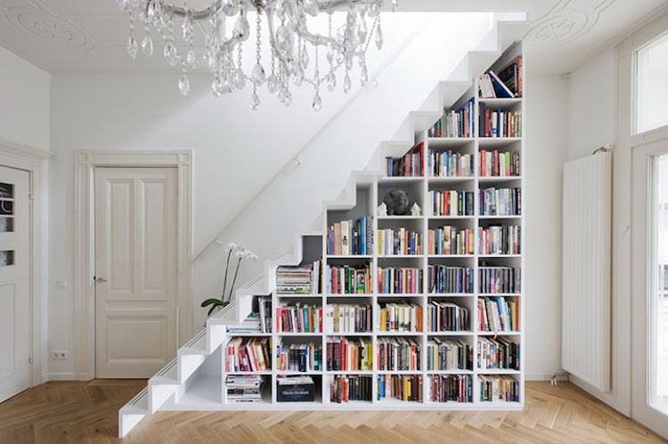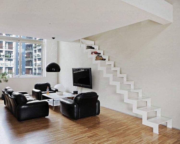 Tangga satu ini didesain dengan bentuk lurus tanpa belokan sama sekali. Karena didesain lurus, maka tersedia space kosong yang cukup besar di bagian bawah tangga. Space kosong bawah tangga ini bisa dipakai sebagai tempat rak buku sehingga dapat memaksimalkan fungsi ruangan.