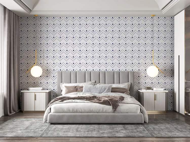 Selain motif yang terkesan natural, interior rumah di kamar Anda juga bisa dihiasi dengan wallpaper bermotif unik. Seperti garis berelombang dengan titik hitam yang simetris. Warnanya yang kalem akan membuat suasana di dalam kamar semakin nyaman dan enak buat tidur.