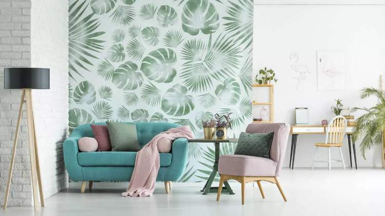 Selain menempatkan pot tanaman hias di dalam ruangan, kesan yang asri dan sejuk juga bisa didapatkan dengan memasang wallpaper motif daun tropis. Warna hijaunya yang segar dengan motif daun yang unik membuat suasana di dalam rumah terasa lebih sejuk dan adem.